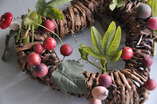Hello Helen...So much festive loveliness here!...Your heart shaped wreath looks so pretty as does your little toadstool tealight and holly cupcakes...and I love those splashes of red from your geraniums...