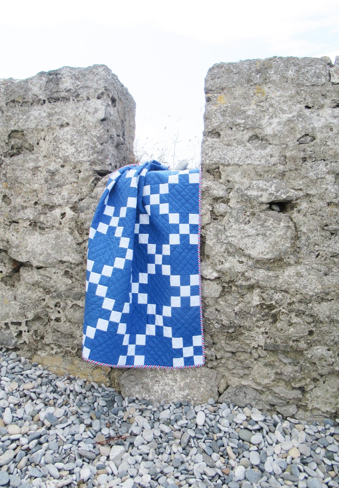 Those seaside blues are incredible and so much light too! The contrast of your new quilt against the pebbles and stone wall makes it look fabulous.